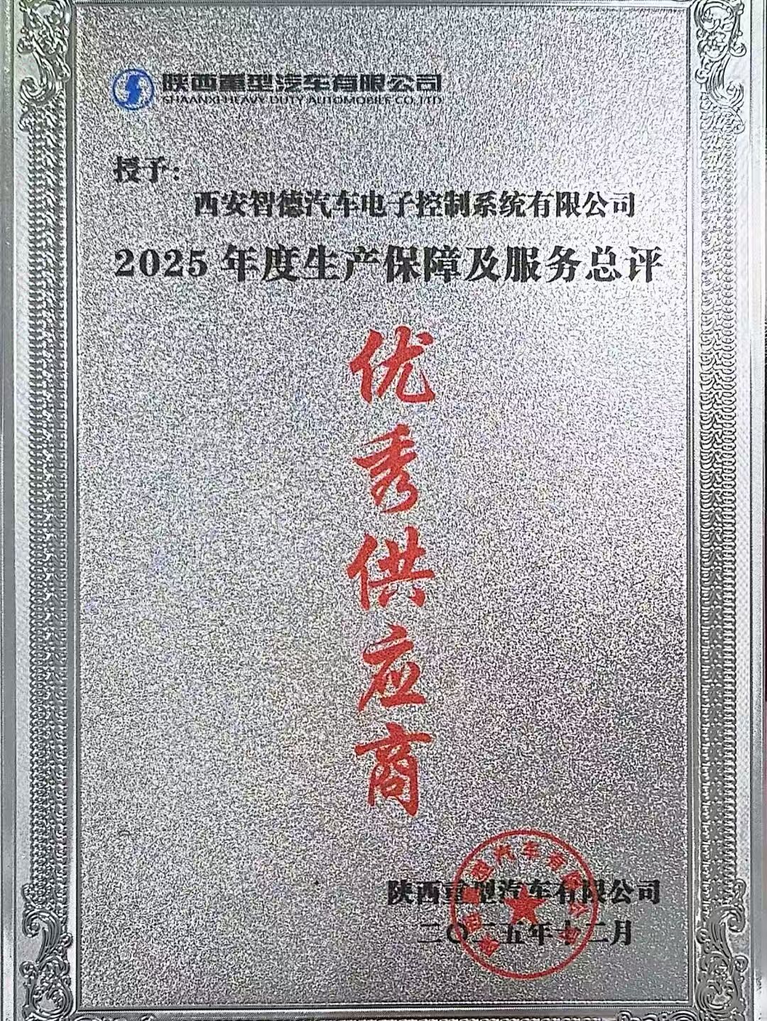 2025年,智德电控聚焦生产体系优化、供应链协同与服务能力提升,持续夯实保产保供能力,全年电驱系统销量较去年同比增长超205%,行业影响力进一步扩大。凭借稳定可靠的产品表现、快速响应的交付能力以及与主机厂深度协同的合作模式,智德电控荣获陕汽重卡2025年度优秀供应商战略协同奖、陕汽重卡2025年度生产保障及服务总评优秀供应商,质子汽车2025质链战略供应商等荣誉,综合实力与行业认可度持续提升。